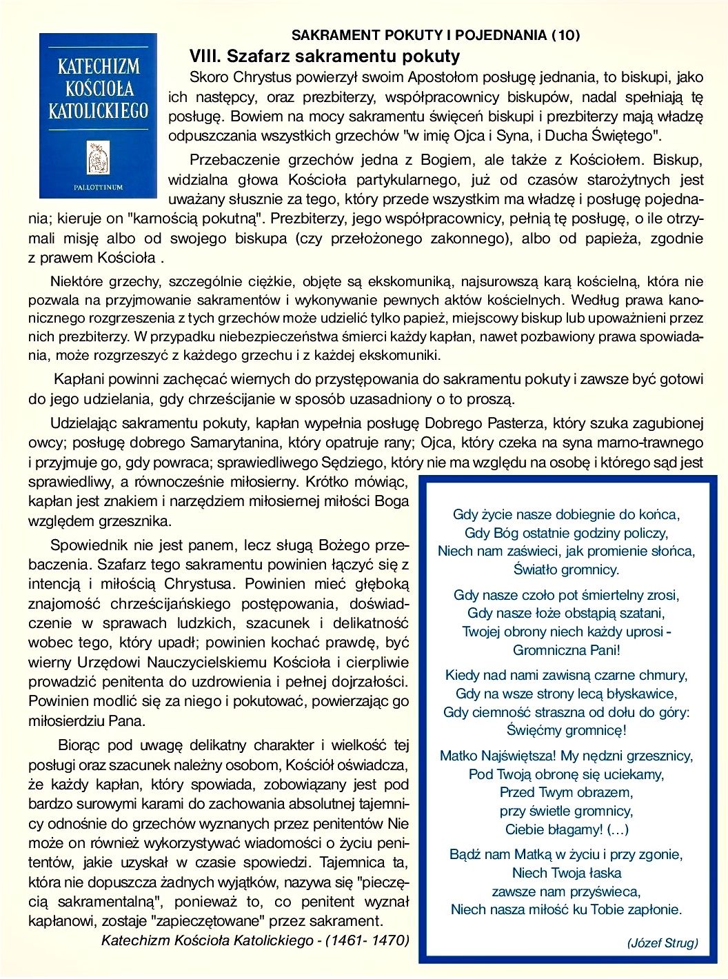 Dworzanie noszą u boku miecz, aby bronić swojej królowej. Podobnie dworzanie Maryi winni przypasać miecz, aby bronić czci swojej Królowej, a tym mieczem jest różaniec. Wielkie jest znaczenie i błogosławione skutki tego nabożeństwa. Różaniec bowiem jest modlitwą bardzo doskonałą, bo modlitwę ustną łączy z rozmyślaniem, i bardzo skuteczną, ponieważ składa się z modlitw Bogu najmilszych, jakimi są Modlitwa Pańska i Pozdrowienie Anielskie; podobny stąd do napiętego łuku, którego strzały trafiają wprost w Serce Boże. Różaniec jest księgą Maryi, zawierającą w streszczeniu wszystko, co mądrość Bożą wymyśliła najdoskonalszego, a miłość Bożą wykonała najlepszego. Do tej księgi prowadzi Maryja wszystkie swoje dzieci, tak wielkiego mędrca, jak i pokornego prostaczka, otwiera jej strony, to jest tajemnice Chrystusowe, i uczy na ich przykładzie mądrości Bożej. Różaniec jest harfą duchową o piętnastu strunach, z których jedne odzywają się radością, inne cierpieniem, inne triumfem, a których dźwięk rozwesela znękane serce. Różaniec jest wędką, którą Maryja łowi grzeszników i z morza nieprawości wyciąga na brzeg miłosierdzia. Różaniec jest kotwicą, którą Maryja chwyta kuszonych i trzyma przy sobie, by ich nie uniosła fala. Różaniec jest łańcuchem o piętnastu ogniwach, do którego przyczepiamy nasze dusze. Kiedyś ręka Maryi pociągnie ten łańcuch i podźwignie nim na wzgórze niebieskie wszystkich, którzy się go mocno trzymają. Różaniec jest murem obronnym, którym Maryja opasuje Kościół święty, i mieczem pogromu, którym zwalcza jego wrogów. On też starł sektę albigensów i złamał potęgę turecką pod Lepanto.
